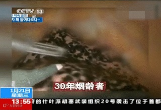 2015年,央视新闻频道曾报道,韩国 KBS 电视台公开了一段肺部内窥镜记录下的影像片段。同时将内窥镜下非吸烟者及不同烟龄人群的肺做了对比。