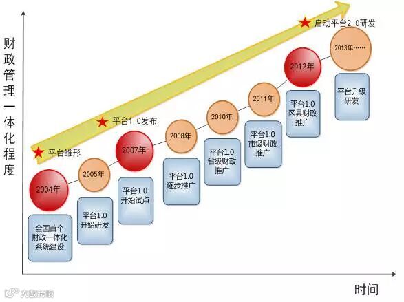 应用支撑平台1.0版本于2005年发布并在中央试点,2007至2008年在山西、四川、青岛等地进行地方试点,继而从2009起在全国所有的省、市、县级财政推广应用。
