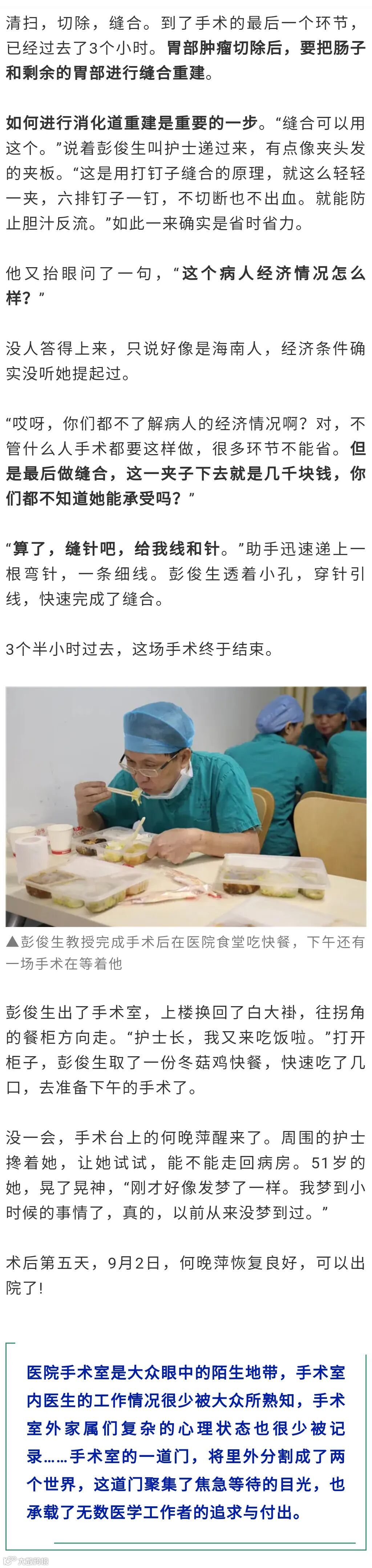 躺在手术台中间,51岁的何晚萍(化名)也准备好了。她和众多来找彭俊生看病的人一样,起初只是觉得胃不舒服,一查结果是胃癌。在昨天的多学科讨论会上,针对她的情况,专家最终决定进行肿瘤切除,彭俊生主刀。