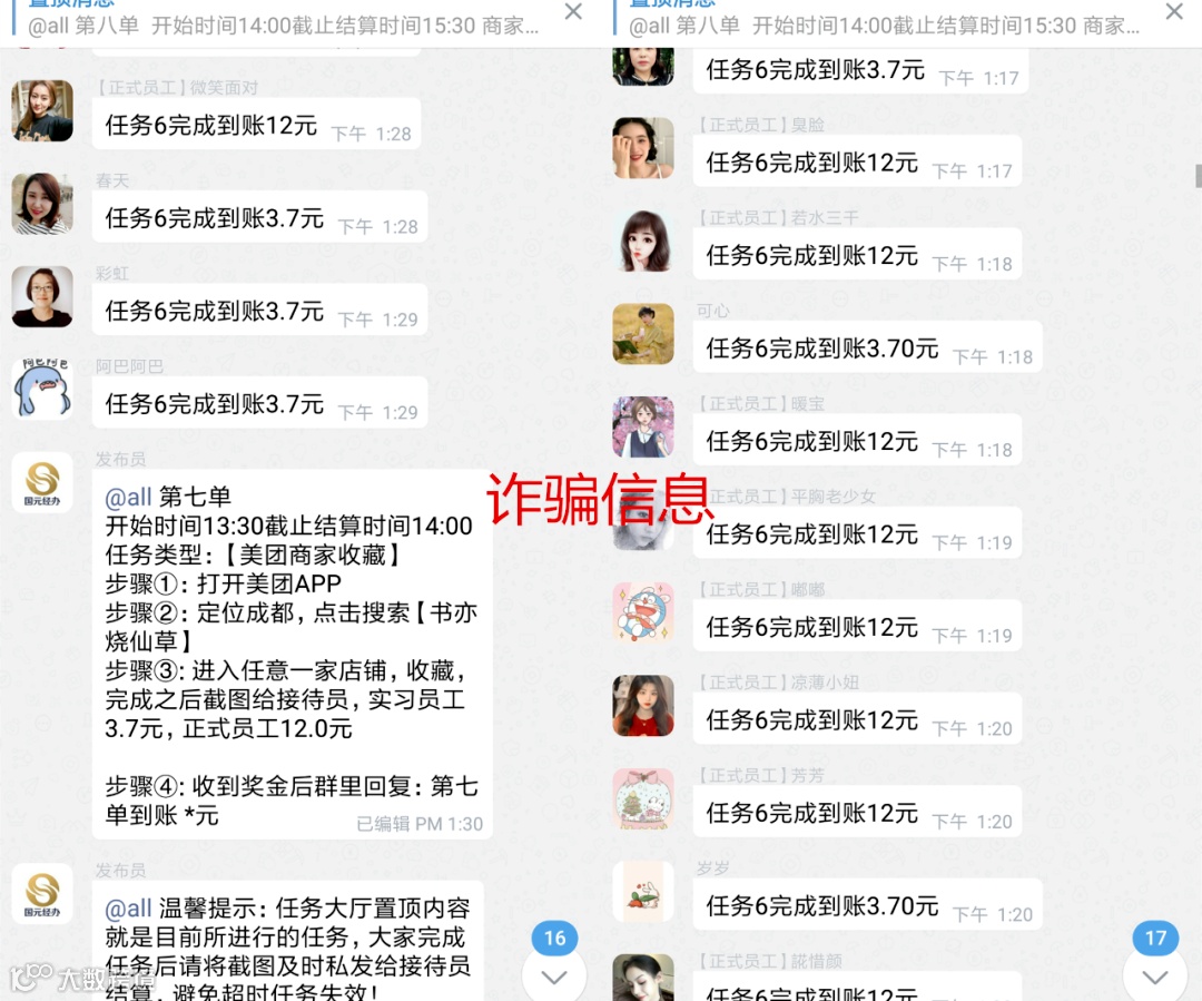 诈骗分子会在群内发放刷单任务,并声称完成即可领取红包,给人带来一些甜头。等你彻底放下防备心后,便引诱你下载软件、充值垫付,完成佣金更高的兼职任务。