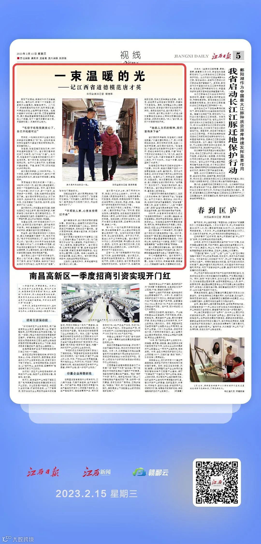 “外婆任何时候都是先想着别人,她助人为乐的精神,我们要传承下去。”张佳港说。由于工作努力,表现突出,2021年以来,他被评为新余市道德模范、“新余有爱”年度人物,当选“江西好人”,入选“中国好人榜”,获得“全省优秀共青团员”称号。听到这些好消息,唐才英总是笑得合不拢嘴。