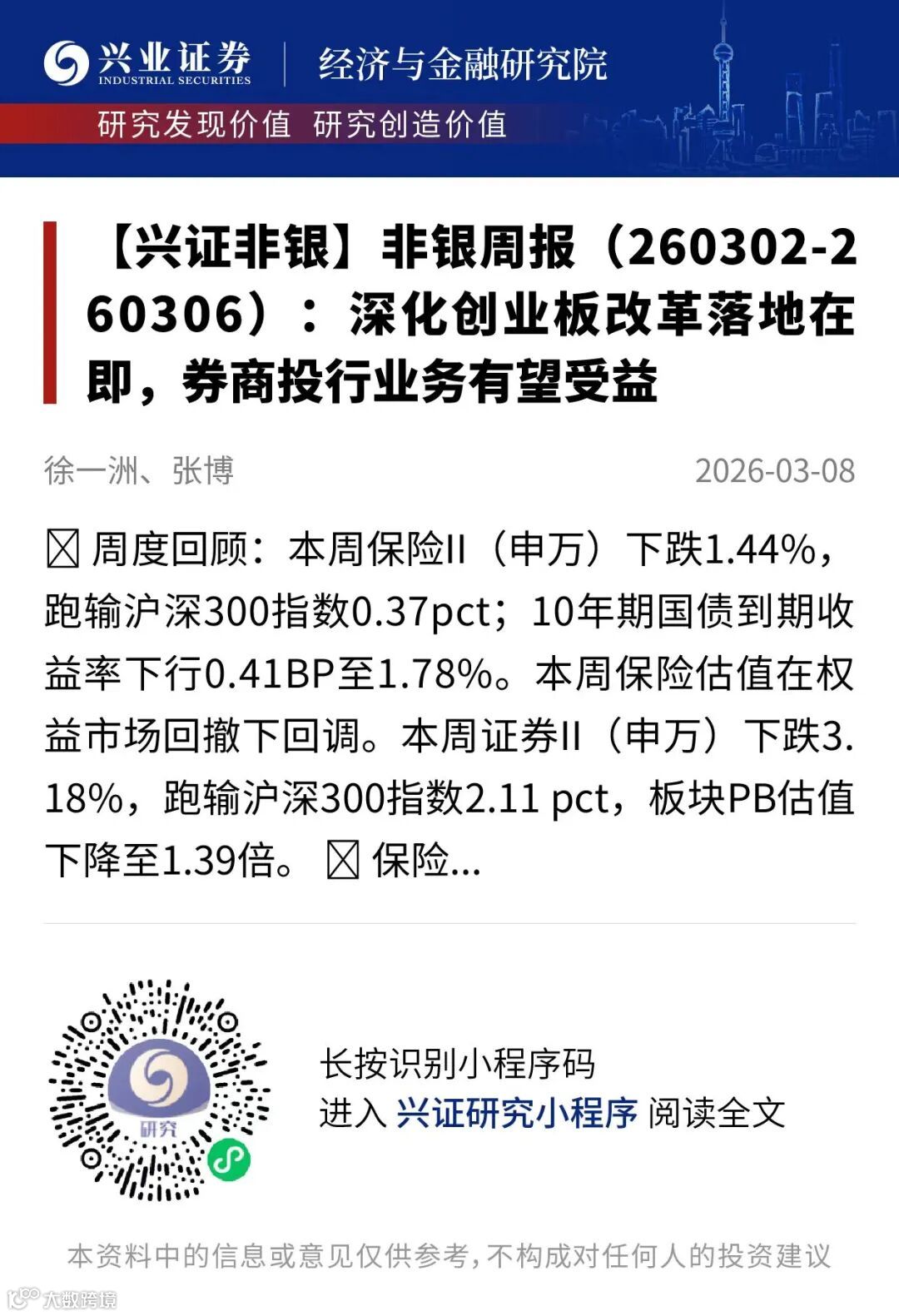 我们发布了《非银周报(260302-260306):深化创业板改革落地在即,券商投行业务有望受益》,欢迎阅读!