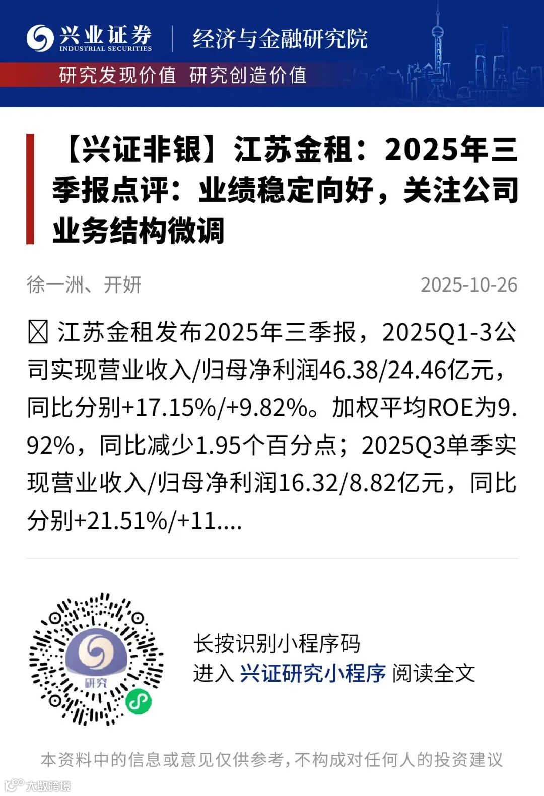 证券研究报告:《【兴证非银】江苏金租2025年三季报点评:业绩稳定向好,关注公司业务结构微调》