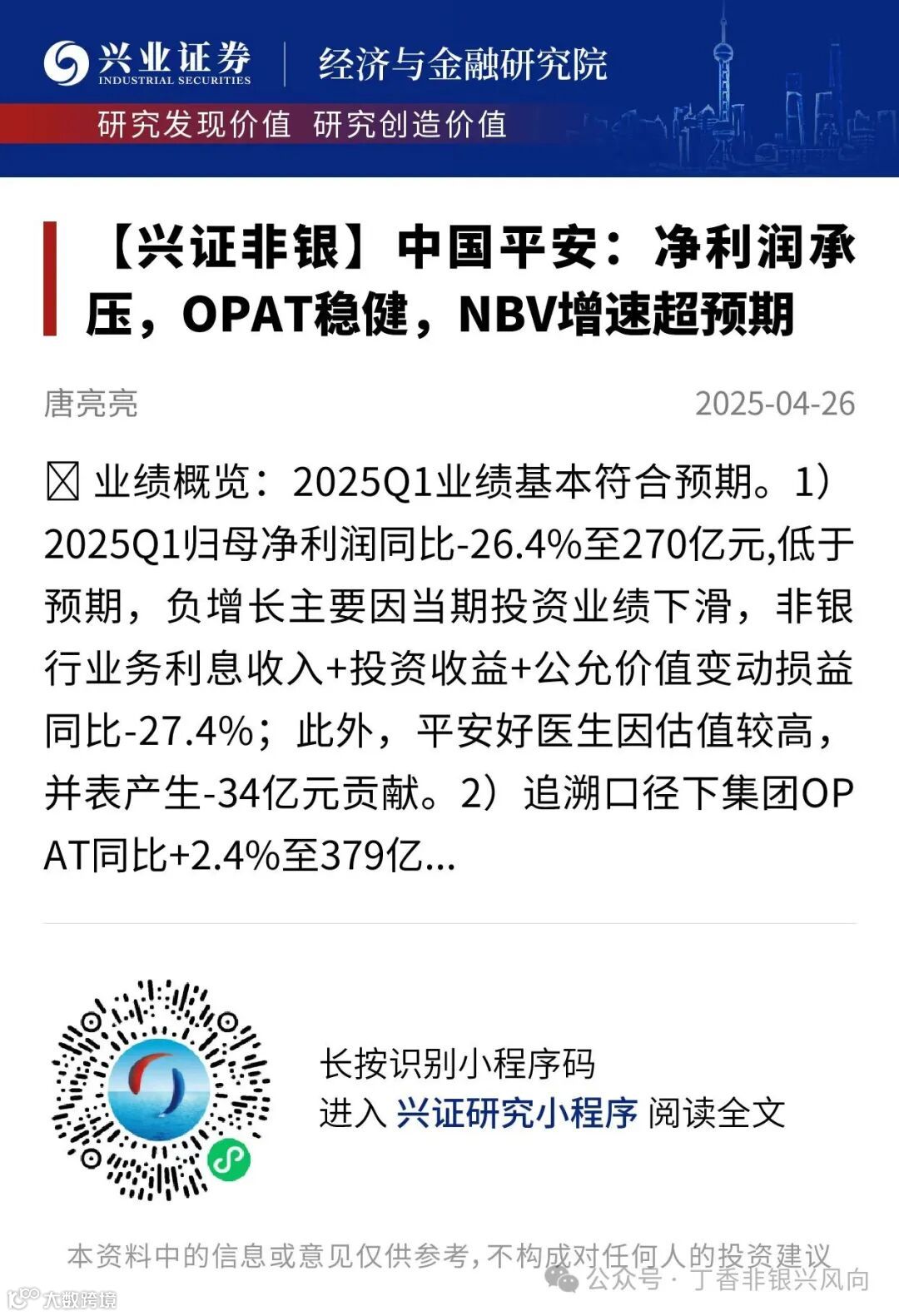 证券研究报告:《中国平安2025年一季报点评:净利润承压,OPAT稳健,NBV增速超预期》
