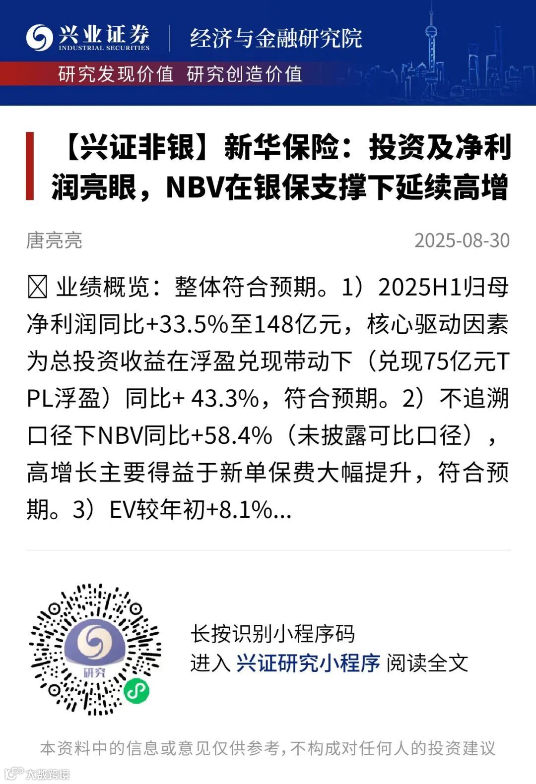 证券研究报告:《新华保险2025年中报点评:投资及净利润亮眼,NBV在银保支撑下延续高增》