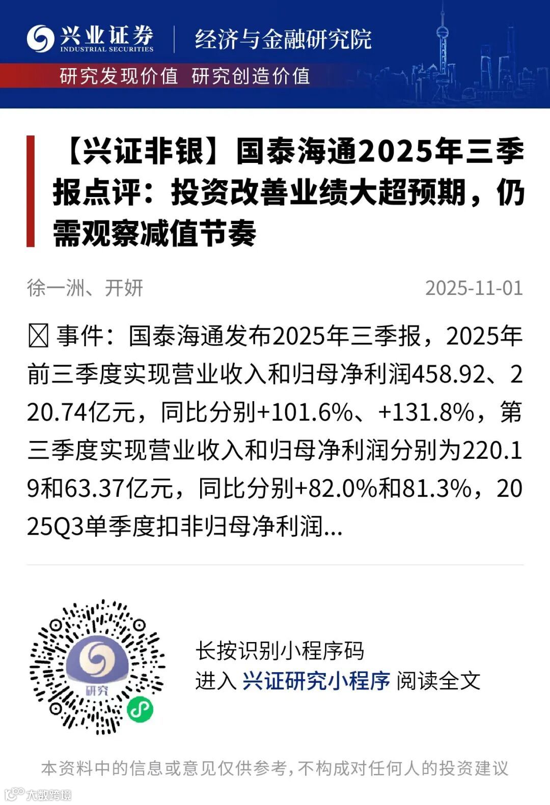 证券研究报告:《国泰海通2025年三季报点评:投资改善业绩大超预期,仍需观察减值节奏》