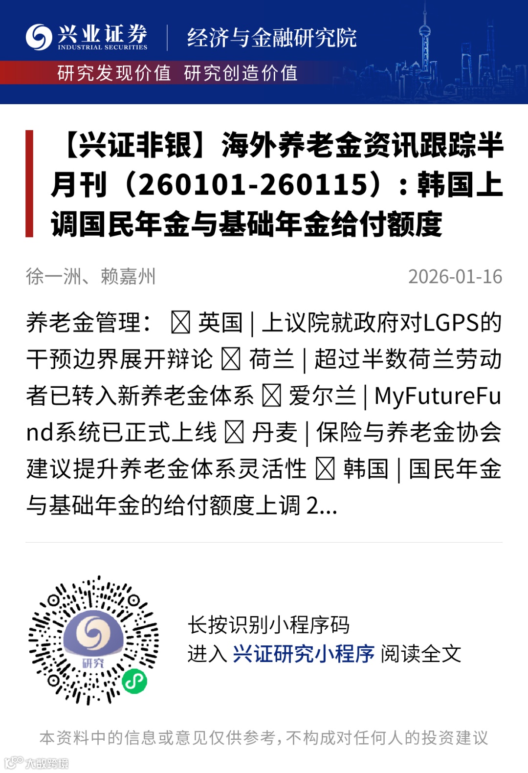 证券研究报告:《海外养老金资讯跟踪半月刊(260101-260115): 韩国上调国民年金与基础年金给付额度》