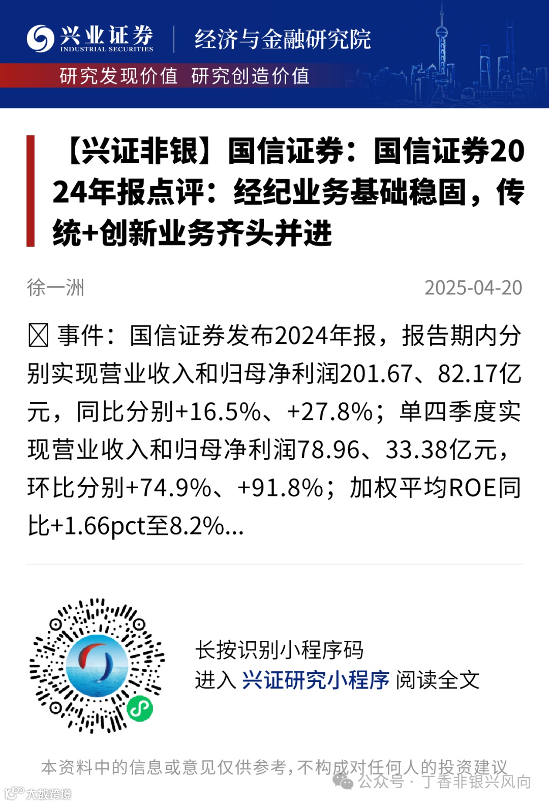 事件:国信证券发布2024年报,报告期内分别实现营业收入和归母净利润201.67、82.17亿元,同比分别+16.5%、+27.8%;单四季度实现营业收入和归母净利润78.96、33.38亿元,环比分别+74.9%、+91.8%;加权平均ROE同比+1.66pct至8.2%,剔除客户资金后经营杠杆较年初-6.0%至3.46倍。