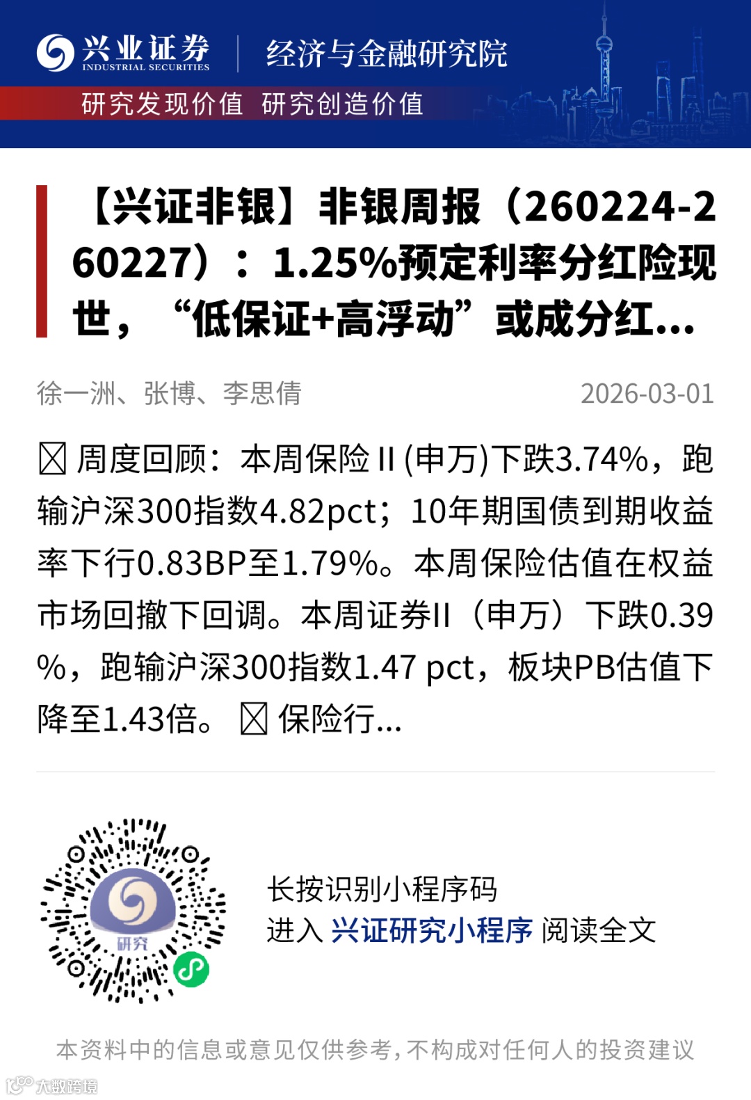 我们发布了《非银周报(260224-260227):1.25%预定利率分红险现世,“低保证+高浮动”或成分红险新范式》,欢迎阅读!