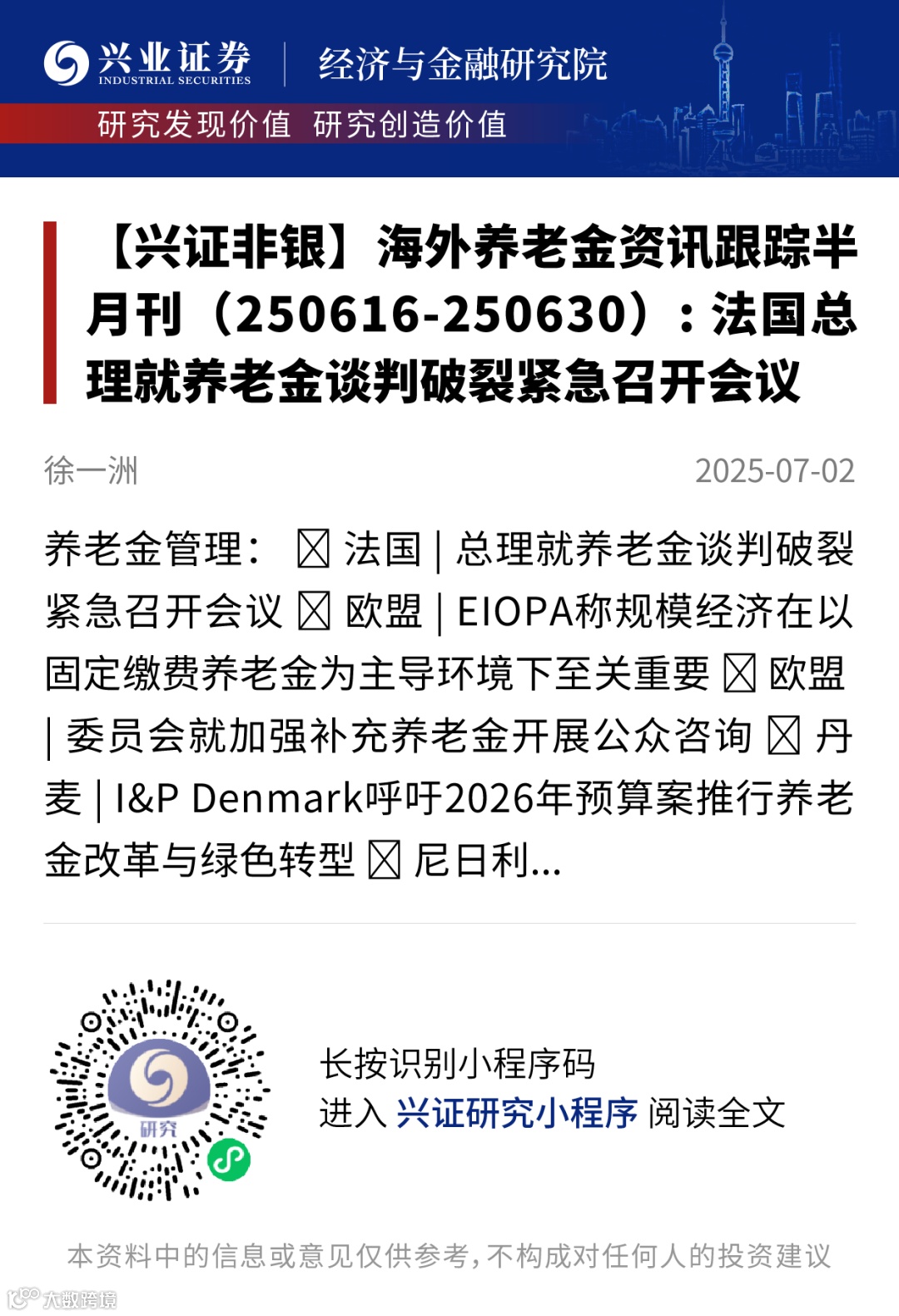 证券研究报告:《海外养老金资讯跟踪半月刊(250616-250630):法国总理就养老金谈判破裂紧急召开会议》