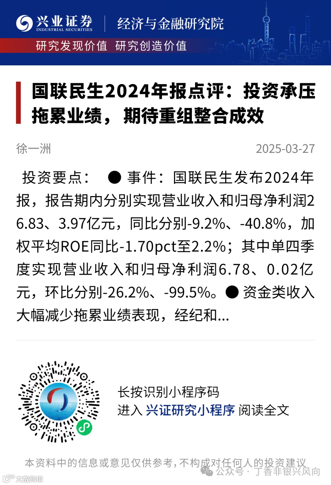 证券研究报告:《国联民生2024年报点评:投资承压拖累业绩,期待重组整合成效》
