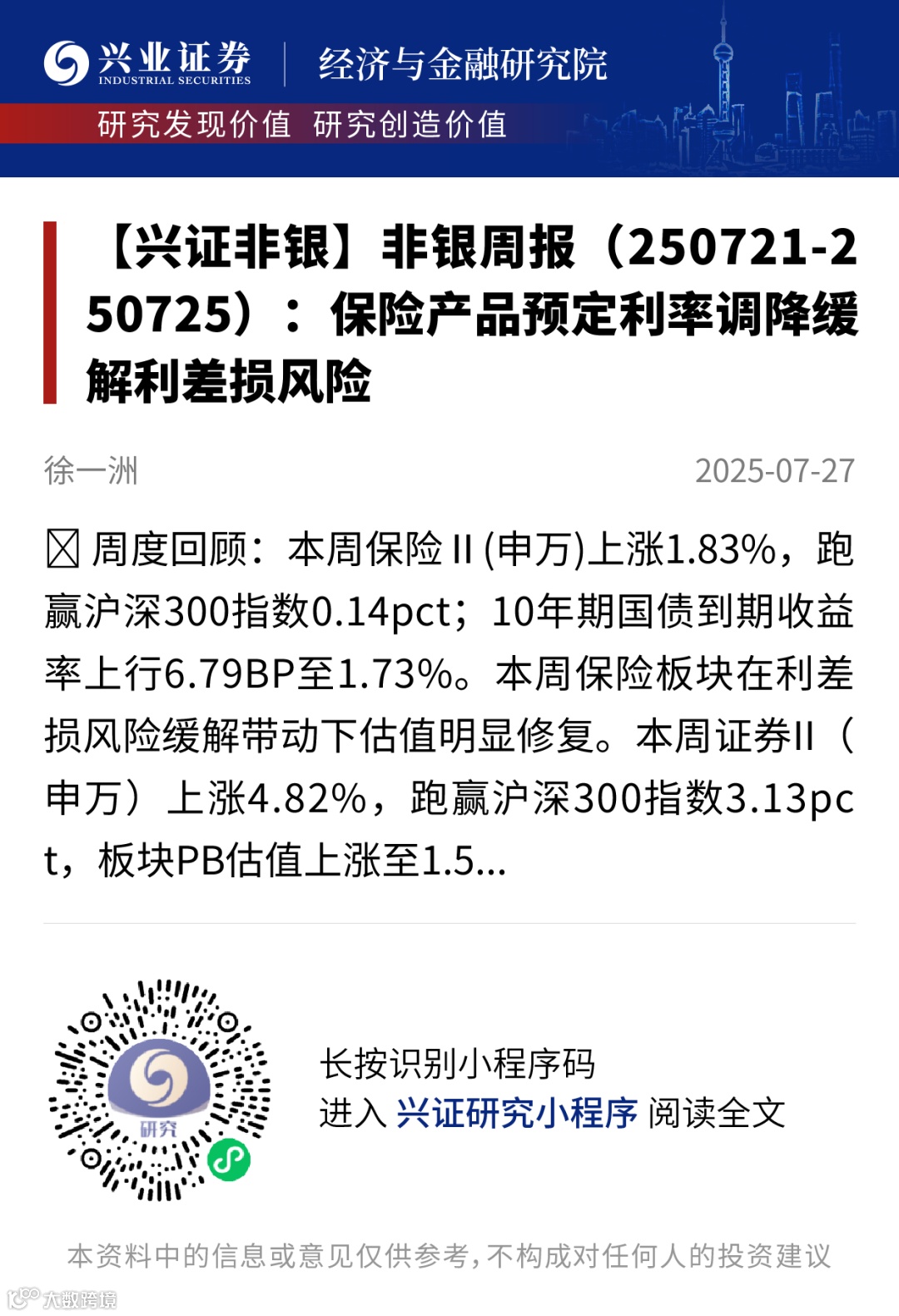 我们发布了《非银周报(250721-250725):保险产品预定利率调降缓解利差损风险》,欢迎阅读!