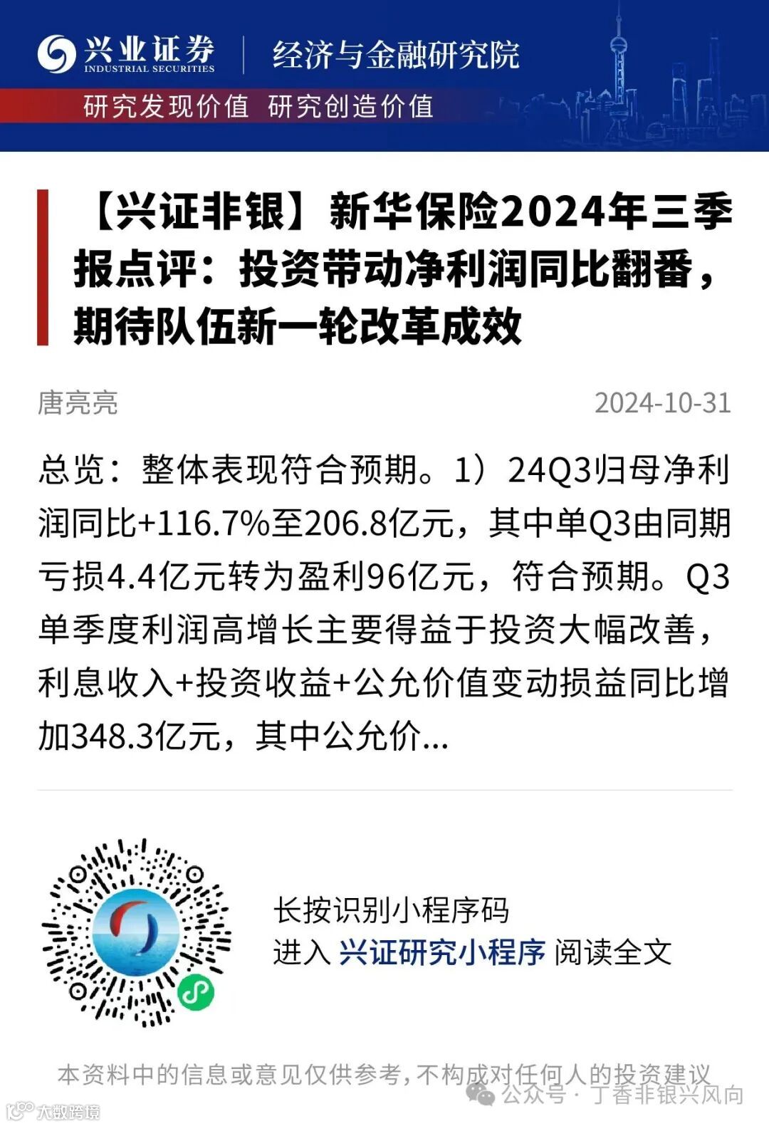 证券研究报告:《新华保险2024年三季报点评:投资带动净利润同比翻番,期待队伍新一轮改革成效》