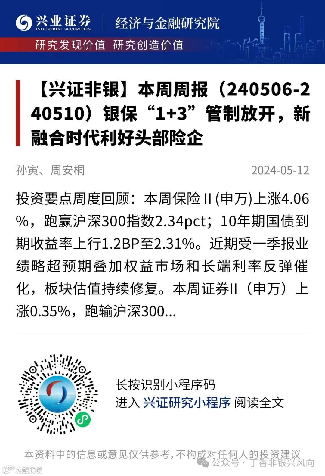 我们发布了《本周周报(240506-240510)银保“1+3”管制放开,新融合时代利好头部险企》,欢迎阅读!