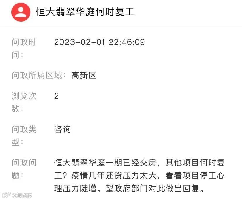 2023年1月14日,区建设和维稳工作专班在恒大翡翠项目联络处与30名业主代表沟通对话,现场通报了保交楼工作进展,宣传了保交楼政策,缓解了业主代表思想情绪,业主要求元宵节后全面复工。