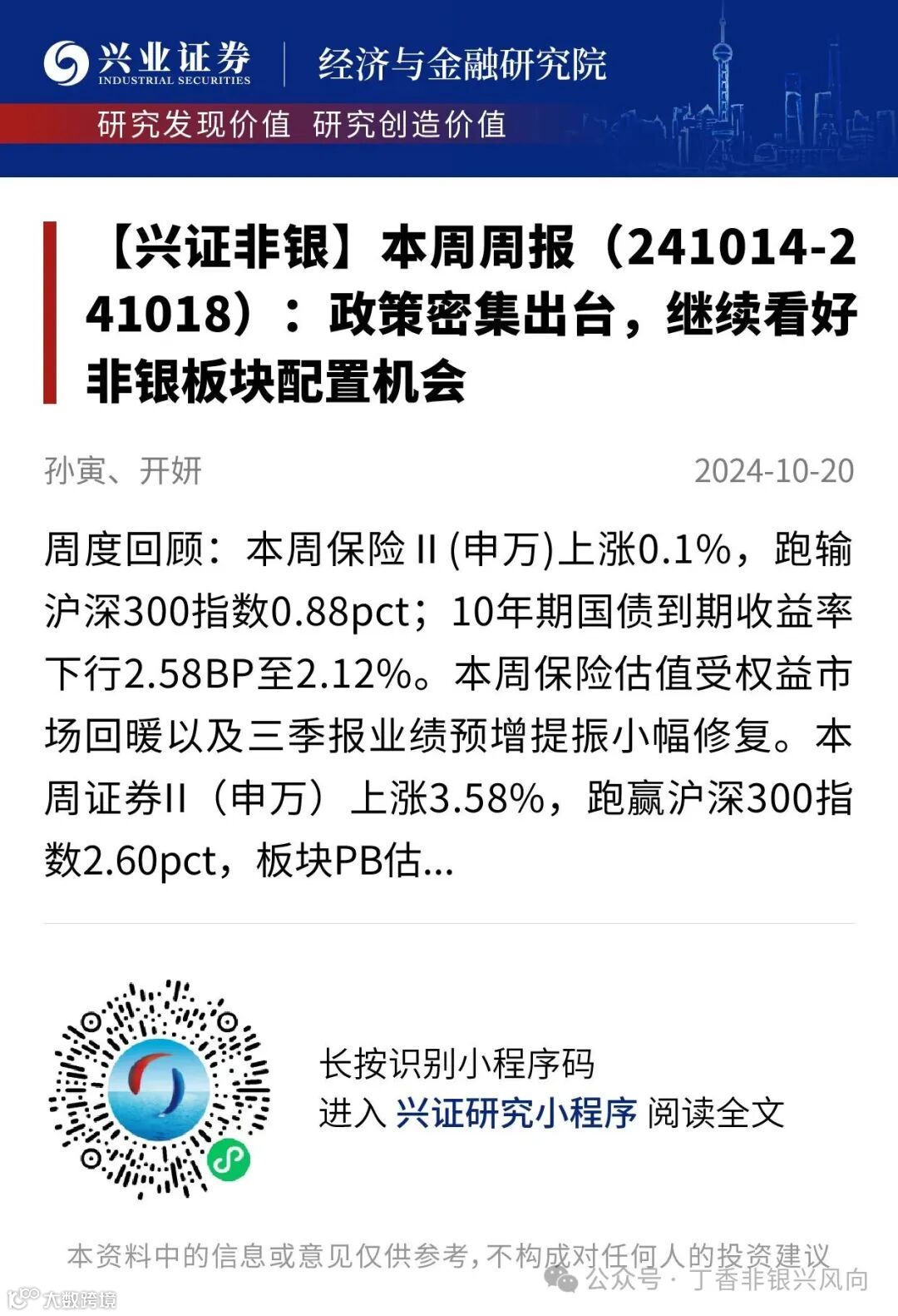 我们发布了《【兴证非银】本周周报(241014-241018):政策密集出台,继续看好非银板块配置机会》,欢迎阅读!