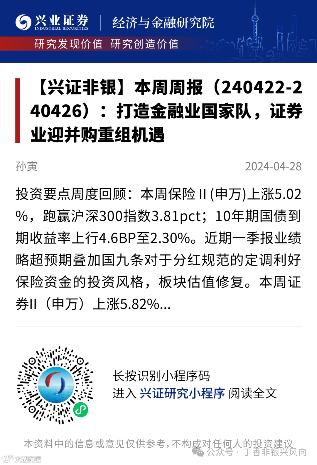 证券研究报告:《本周周报(240422-240426):打造金融业国家队,证券业迎并购重组机会》