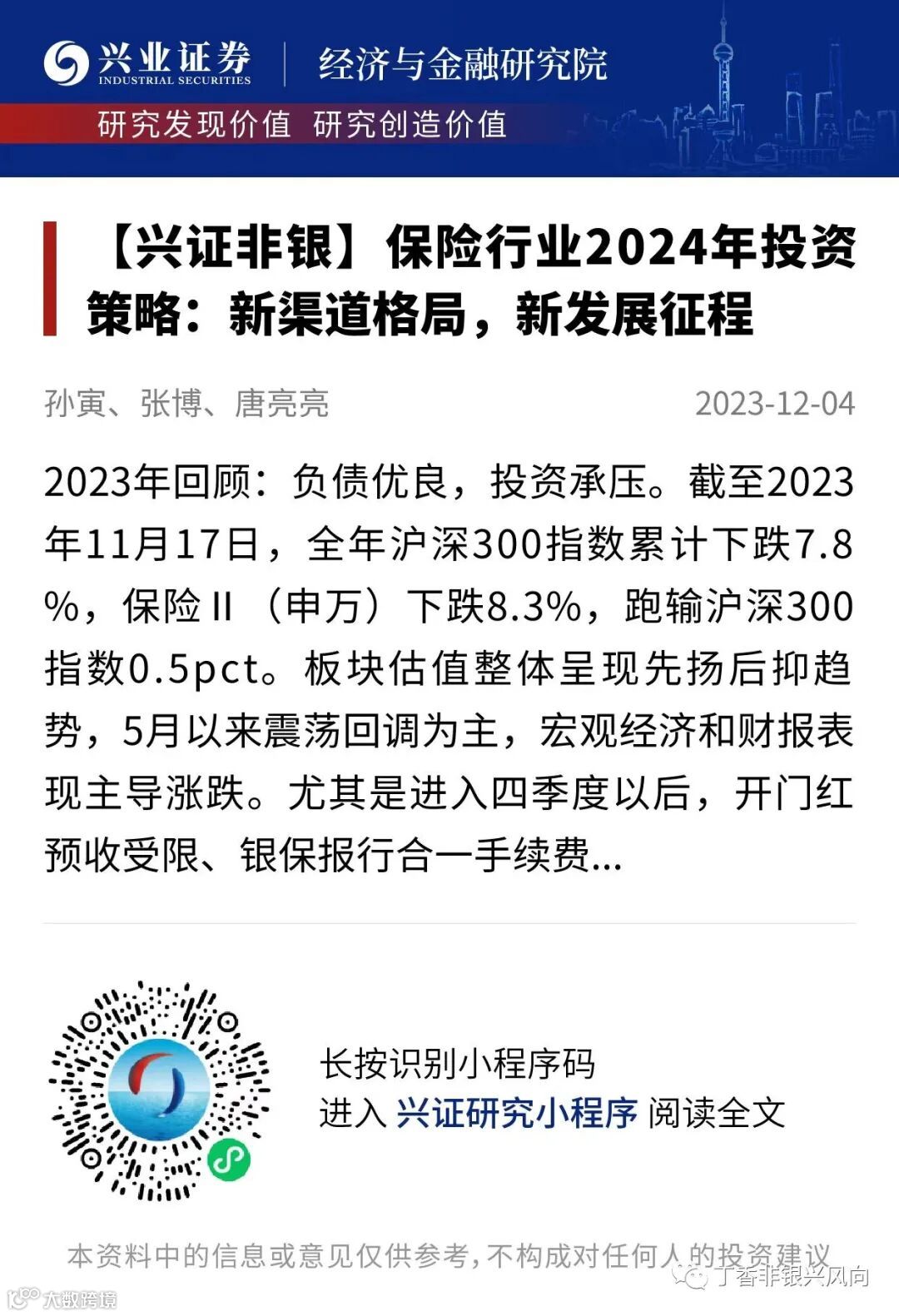 展望2024年,我们认为保险负债端有望延续复苏势头,源于新渠道格局下存在银保负债成本优化带来“价”提升的超预期可能,叠加投资收益有望边际向好,板块估值存在改善机会,继续看多。