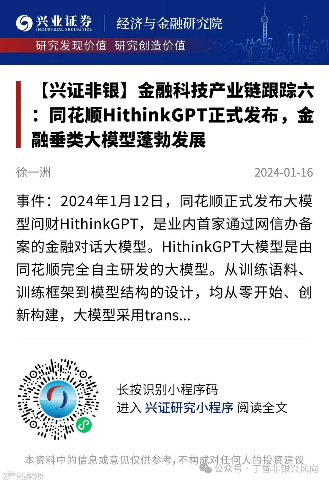 欢迎阅读:《【兴证非银】金融科技产业链跟踪六:同花顺HithinkGPT正式发布,金融垂类大模型蓬勃发展》
