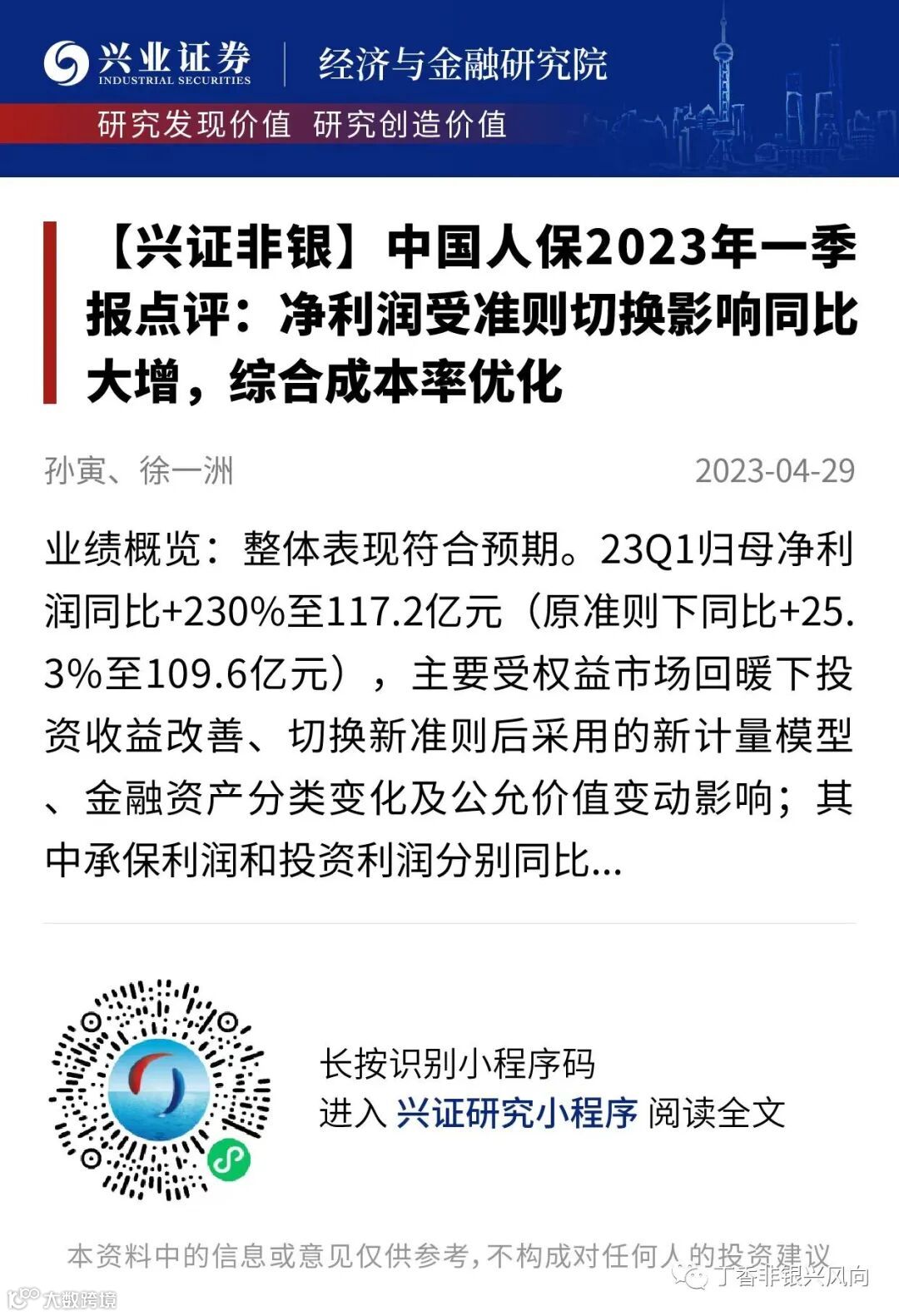 近日,中国人保发布2023年一季报,整体符合预期:23Q1归母净利润同比+230%至117.2亿元(原准则下同比+25.3%至109.6亿元),主要受权益市场回暖下投资收益改善、切换新准则后采用的新计量模型、金融资产分类变化及公允价值变动影响;其中承保利润和投资利润分别同比+114.1%、+23.8%。财产险、寿险和健康险公司保费收入分别同比+10.2%、-0.6%、+10.7%。财险综合成本率同比优化。我们在《中国人保2023年一季报点评:净利润受准则切换影响同比大增,综合成本率优化》中详细阐述其2023年一季度的业绩表现,欢迎阅读!
