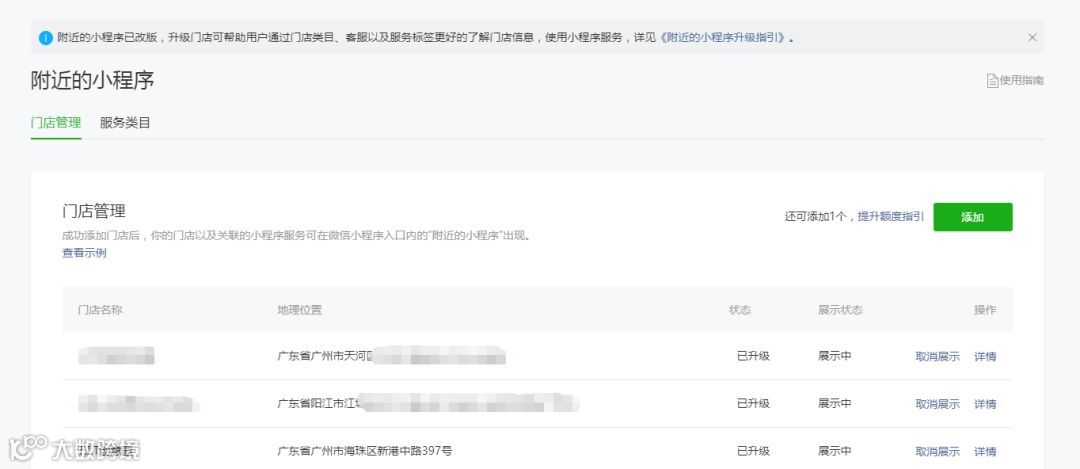 已开通过“附近的小程序”的运营者,可以通过提示的升级流程补充相关信息,详情见《附近的小程序升级指南》。