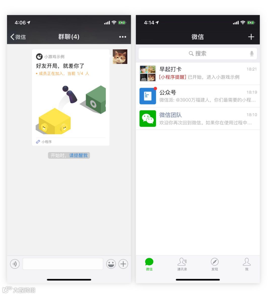 小程序和小游戏的群分享卡片支持实时显示活动参与人数,同时分享者和点击过该分享卡片的参与者,可以使用“请提醒我”按钮,及时接收活动开始提醒以获取相关活动资讯。详见《动态消息》