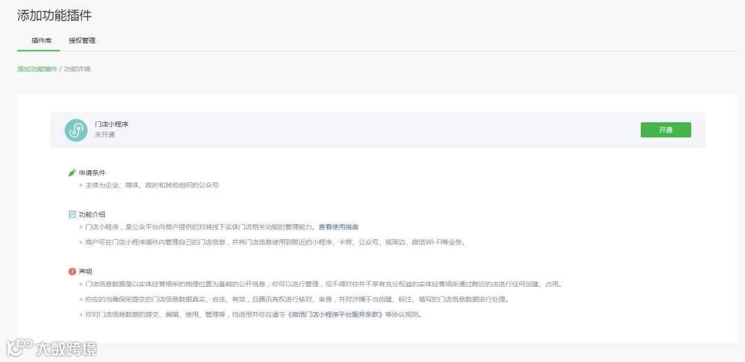 未开通门店小程序的运营者,可在添加功能插件入口处申请,详情见《门店小程序使用指南》和《门店管理升级门店小程序教程》;