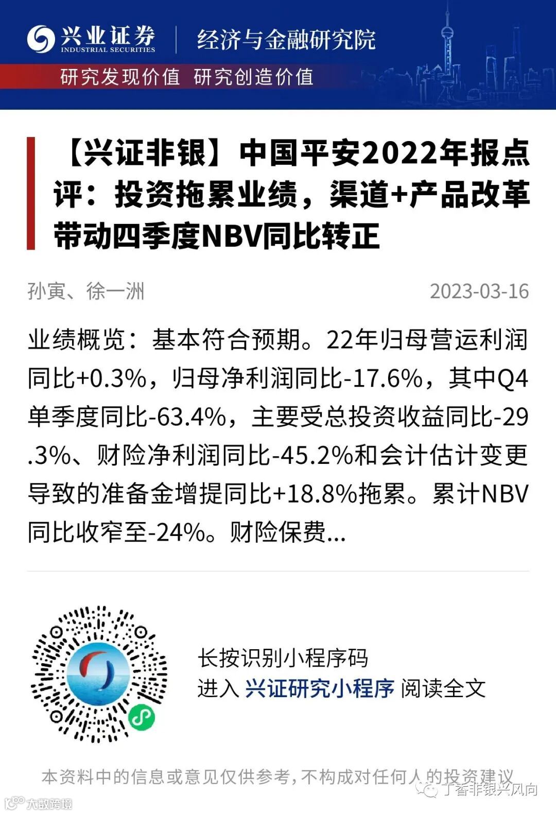 近日,中国平安发布2022年报,整体看基本符合预期。2022年归母净利润同比-17.6%,其中Q4单季度同比-63.4%,主要受总投资收益同比-29.3%、财险净利润同比-45.2%和会计估计变更导致的准备金增提同比+18.8%拖累。人身险累计NBV同比收窄至-24%,财险保费同比+10.4%,COR同比+2.3pct至100.3%。我们在《中国平安2022年报点评:投资拖累业绩,渠道+产品改革带动四季度NBV同比转正》中详细阐述其2022年的业绩表现和投资观点,欢迎阅读!