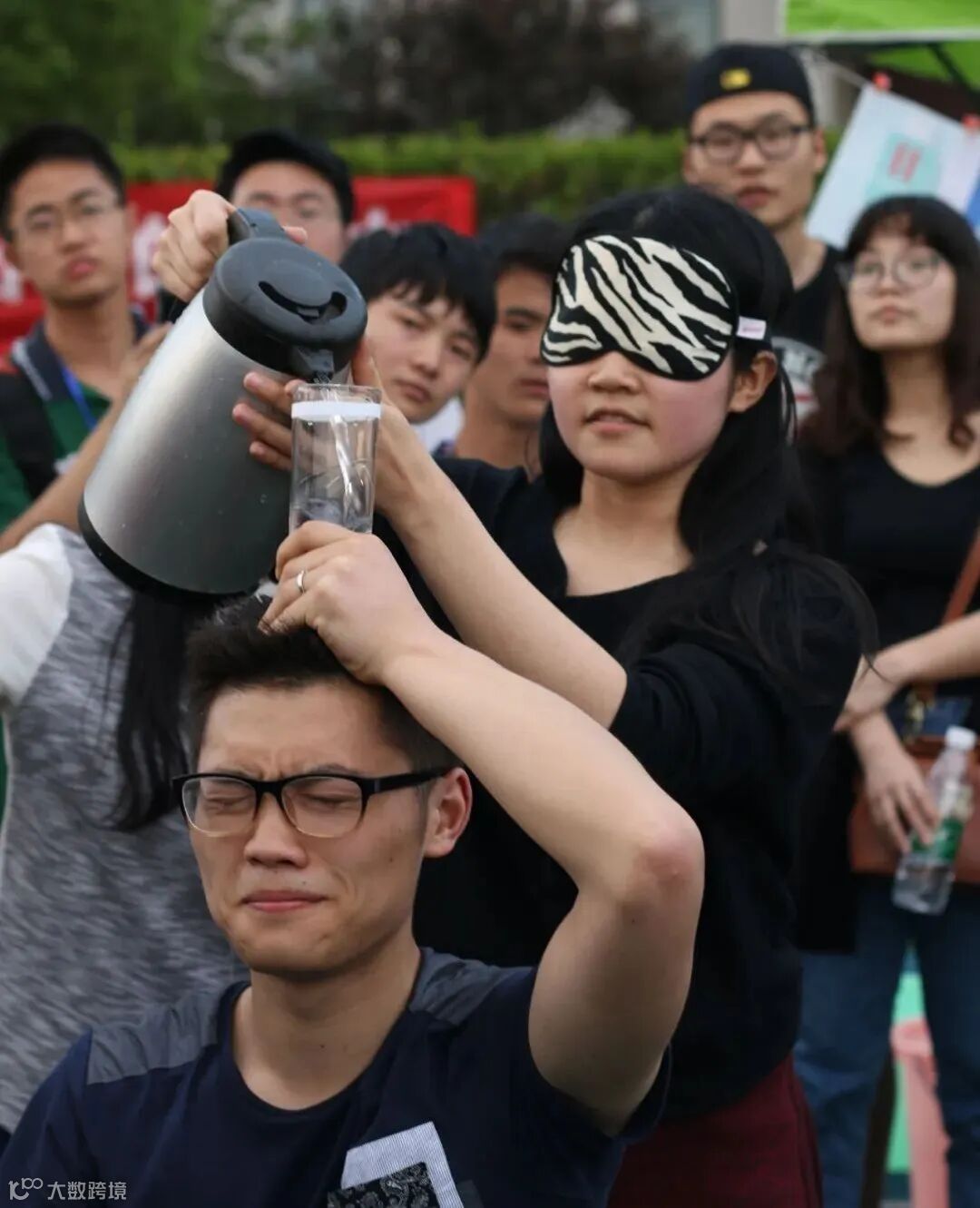 女生蒙眼将手中的水倒入男生手持的容器中