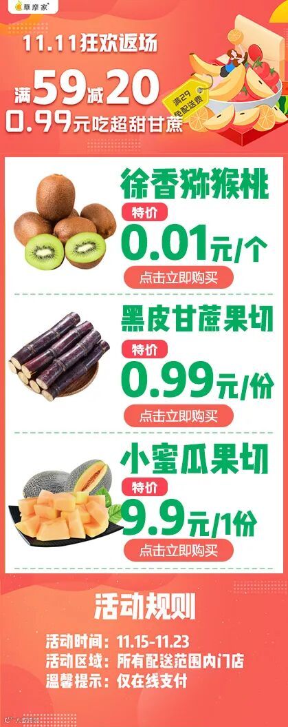 饿了么丨0.01元吃徐香猕猴桃,甘蔗果切0.99元/份,进店领59减20大额满减券!