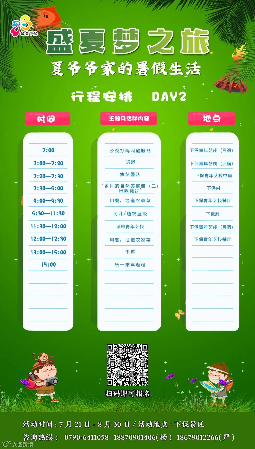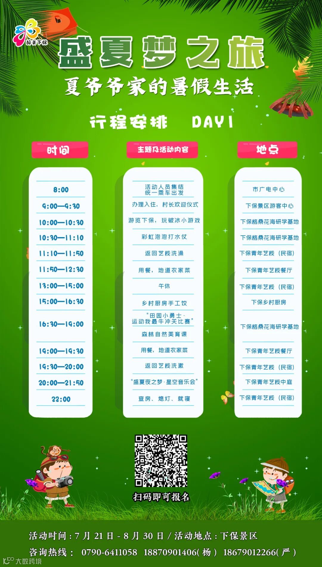 去下保体验一下爷爷辈的生活,抓泥鳅、摸鱼、丛林自然美育课、畅玩乡村乐园、还有夏日撒泼·玩水大战、田园小勇士·运动我最牛冲关比赛、盛夏梦之夜·听爷爷讲过去的故事、玩爸妈小时候玩过的游戏、研学教育等等。摆脱网络的世界,回归真正的田园生活。你们准备假期,剩下的全部交给我们……