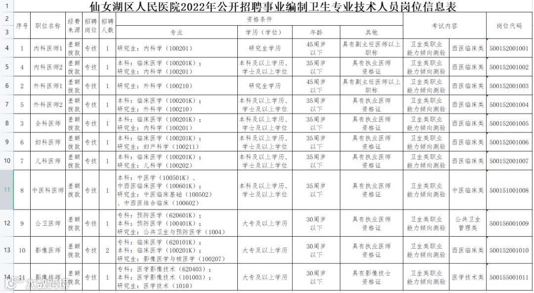 1、招聘岗位、人数及资格条件详见《仙女湖区人民医院2022年公开招聘事业编制卫生专业技术人员岗位信息表》(见附件1)。