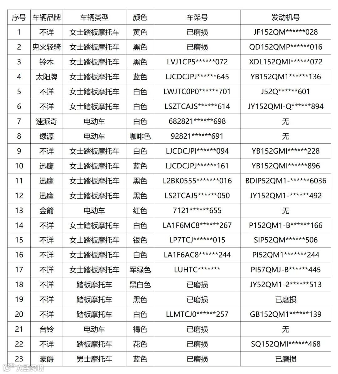 新余市公安局渝水分局特巡警大队在日常管理和各专项行动中,查扣收缴了一批无主车辆,虽经努力查找并予以返还,仍有23辆车辆无人认领。根据有关规定,现对该23辆无主车辆信息予以公告,请各位车主自本公告之日起六个月内(2022年8月12日至2023年2月11日),携带车辆合法证明和车主有效身份证件,到特巡警大队(新余市渝水区劳动南路58号)值班室办理相关手续后进行认领。逾期未认领的,公安机关将对无主车辆依法处理。