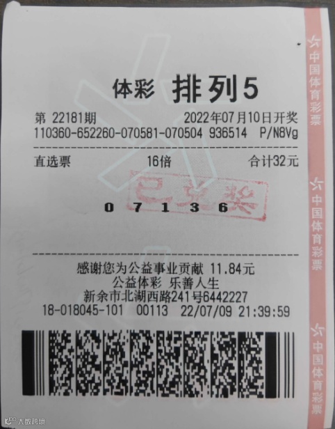 新余购彩者谢先生喜中排列5一等奖16注