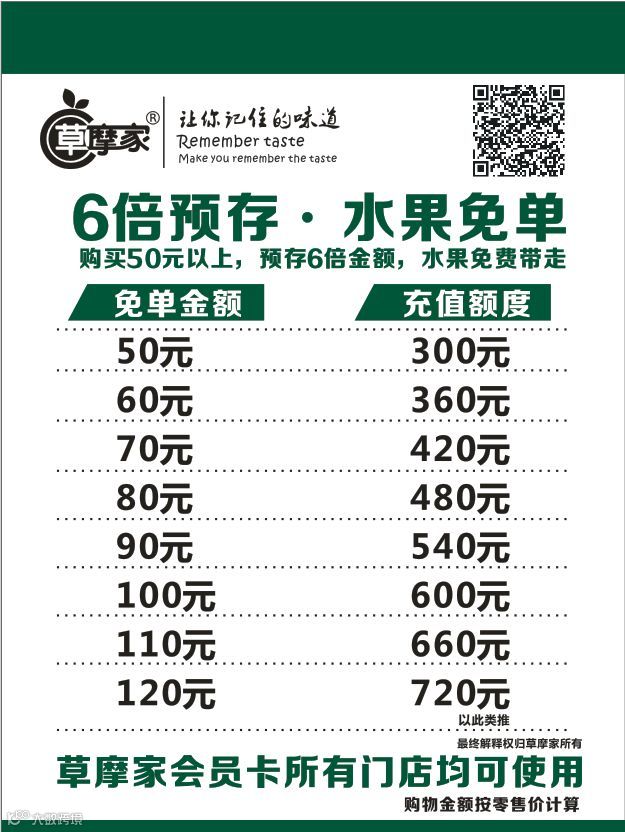 选购了100元的水果,结账时只要预存6倍的购物金额,也就是600元,100元的水果就可以免费拿走,同时还有一张600元的草摩家储值会员卡,下次消费时即可享受门店会员价。(选购水果金额乘以6)