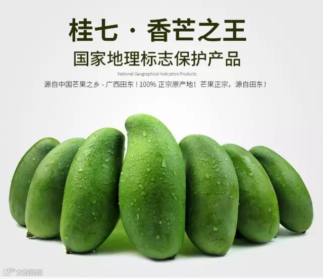 青皮桂七香芒果是广西特有(百色市田东县的县宝)的芒果名品,在广西本地拥有极高的知名度及美誉度,对芒果口味及品质要求较高的人,大多只钟情于桂七芒果而无视其他品种;桂七青皮芒果又名桂热82号,俗称桂七芒。