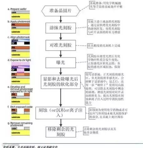 经过提纯得到的多晶硅经过高温熔融,通过拉晶工艺制成纯度高达 99.9999999%以上的高纯单晶硅晶柱。切割晶柱并通过抛光、研磨等工艺,得到薄而光滑的晶圆,后进行检测。 按照设计好的电路,对晶圆进行显影、 掺杂、 蚀刻等复杂的加工处理,分小格,将集成电路“印”在晶圆上。经过晶圆测试后,从晶圆上切割出质量合格的晶块,后进行封装。封装测试通过后,得到可以使用的集成电路芯片。
