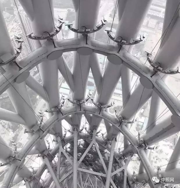 ▲广州塔的LED灯组装在塔身外框筒的内侧,白天效果