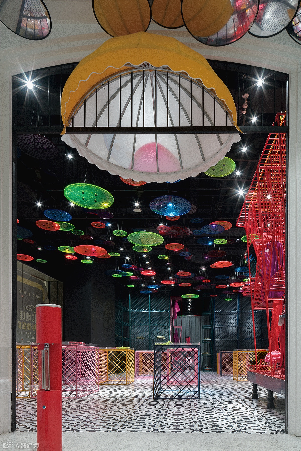 由一根根铁艺曲折而成的彩色货架