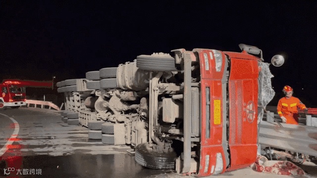 现场为一满载货物的大货车侧翻