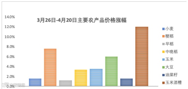 国际市场价格上涨拉动了国内农产品价格。3月26日至4月20日不到1 个月时间,粳稻价格上涨了7.6%,中晚稻和玉米上涨了3.5%,大豆上涨6%,作为饲料的玉米酒糟上涨了12%。如果与去年同期相比,粮食价格仍属于温和上涨,粳稻价格上涨3.6%,籼稻价格上涨9.2%,玉米、高粱上涨7.7%,但是大豆、豆粕、玉米酒糟价格上涨较快,分别上涨18%、20%和23.5%。