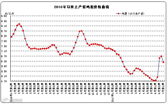 从下面的鸡蛋价格走势图明显看到,全国蛋价在连续上涨5周之后,进入7月份终于撑不住,震荡起来。这一震是真的,此前的上涨却是假相。