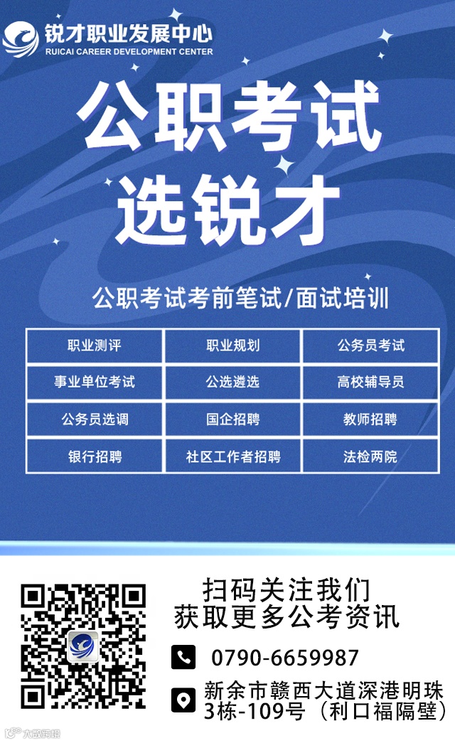 锐才职业发展中心是锐才人力资源开发有限公司旗下的公职教育培训品牌,创立于2005年,是江西省本土首家公考教育培训机构。