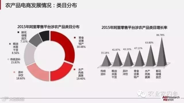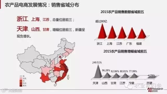 最近,阿里研究院在首届中国农产品电子商务峰会上发布的《阿里农产品电子商务白皮书(2015)》显示,阿里零售平台上农产品卖家地域分布特点为:广东省的数量最多,超过10万,其次是浙江、江苏;陕西增幅最快,达56.35%,其次是山西、江西。