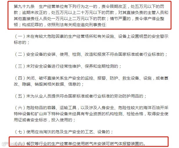 《中华人民共和国安全生产法》第九十九条还规定,餐饮等行业的生产经营单位使用燃气未安装可燃气体报警装置的,将进行相应处罚;情节严重的,责令停产停业整顿;构成犯罪的,依照刑法有关规定追究刑事责任。