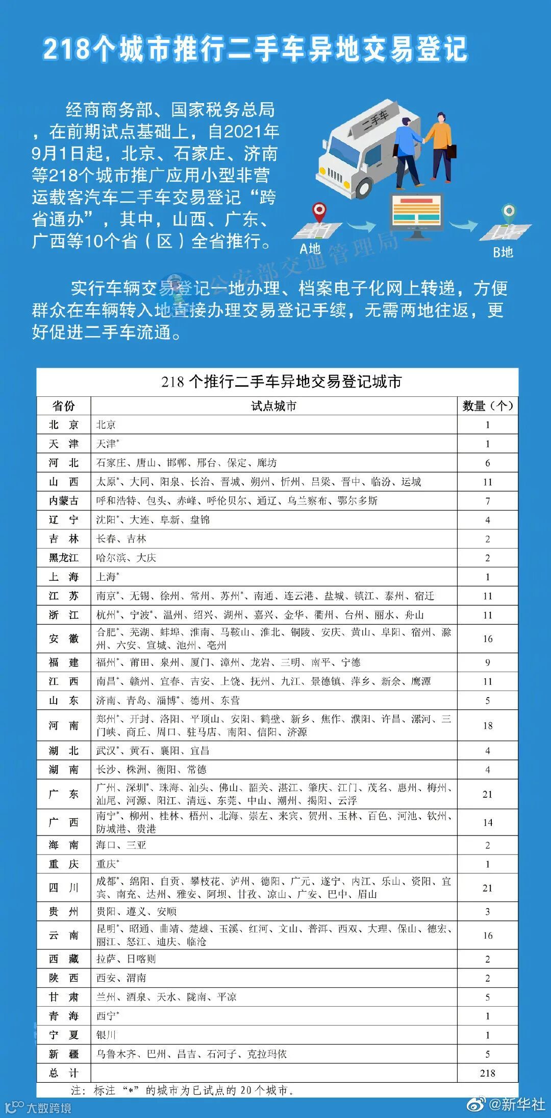 9月1日起,公安部将在全国218个城市推行二手车异地交易登记“跨省通办”,南昌、赣州、宜春、吉安、上饶、抚州、九江、景德镇、萍乡、新余、鹰潭同步推行。据了解,对二手车需要在异地交易的,实行二手车交易登记一地办理、档案电子化网上转递,实现二手车全国范围内跨省跨市异地交易登记,无需两地往返,更好促进二手车流通。