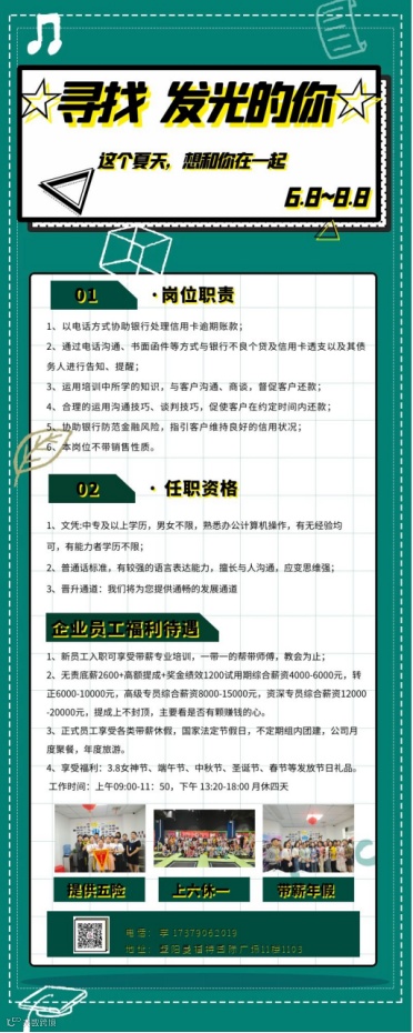 暑假工1、男女不限,高中应届生跟大学生语言表达沟通能力强2、工资底薪+奖励可达100~300元/天3、上班可选择自由,详细电话联系