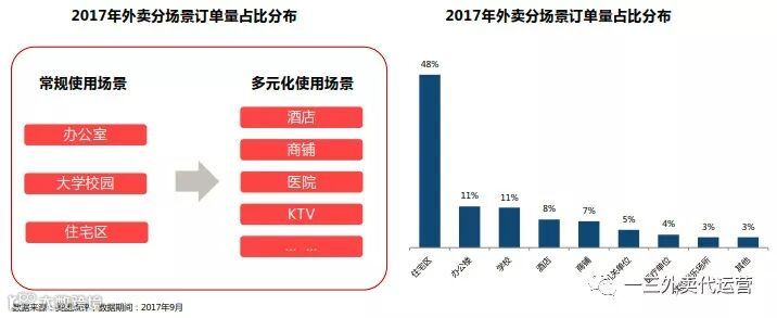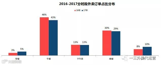 从时间看,2017年的非正餐时段的外卖订单占比近一步提高,将午餐和晚餐正餐时段的订单占比由76%压缩至72%,下降4个点。其中早餐占比5%,上升2个点,夜宵占比10%,上升2个点。周末订单量占比超过三成这说明正餐之外的消费场景存在巨大增量空间,外卖正在从快餐向其他餐饮业态渗透。