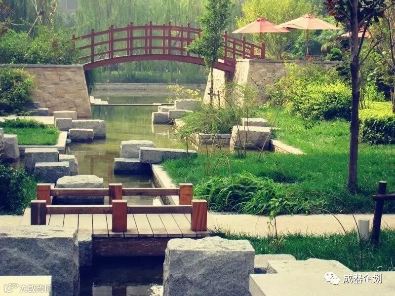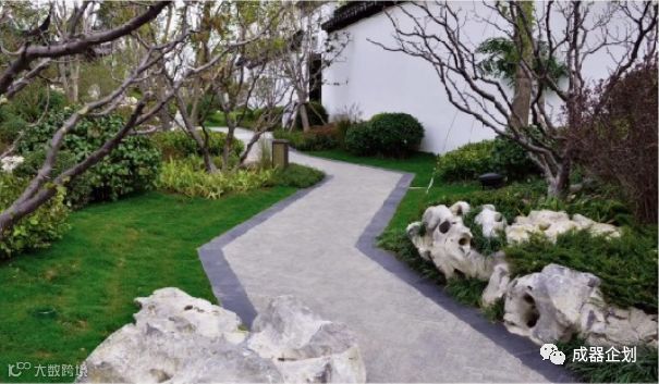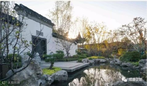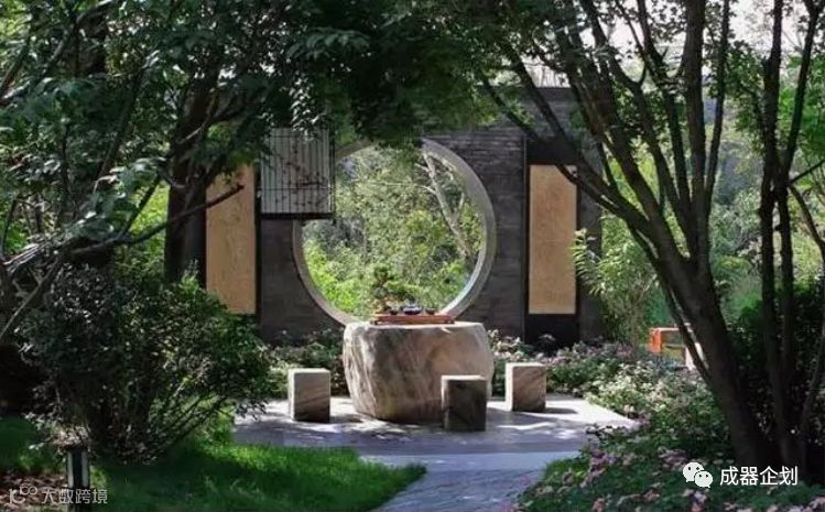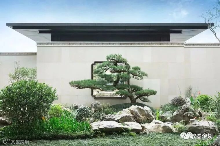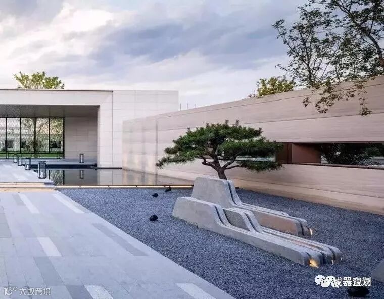 现在很多新中式楼盘很多引入日本枯山水形式,一棵婆娑的造型树,几块拙石,再点缀一些卵石、白沙……一个小小的角落,悉心的雕琢一番,便是一方自在天地,生一隅禅意。
