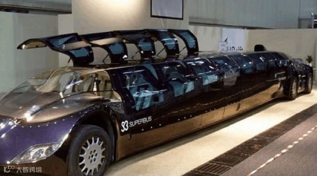 这款“超级巴士”可以为23名乘客提供超舒适、超豪华运程。其身长15米,宽2.5米,高1.65米,配备了16扇鸥翼式车门。